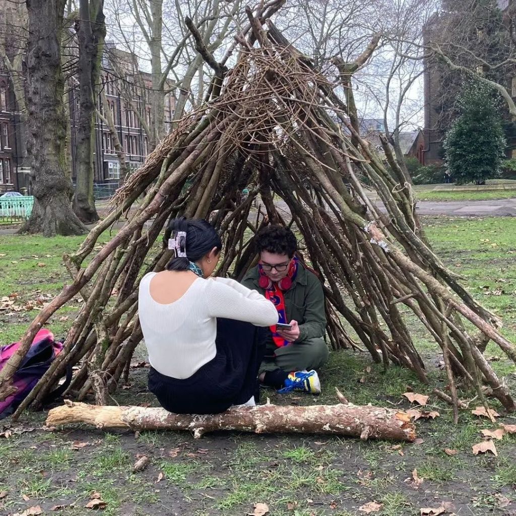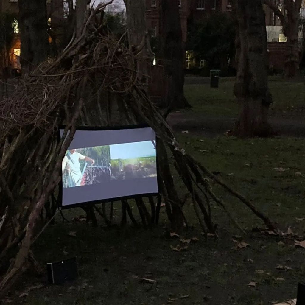 A hut erected in a race against sunset in St. Pancras Old Church gardens in January. Video screenings inside the structure. Interactive reading performance.